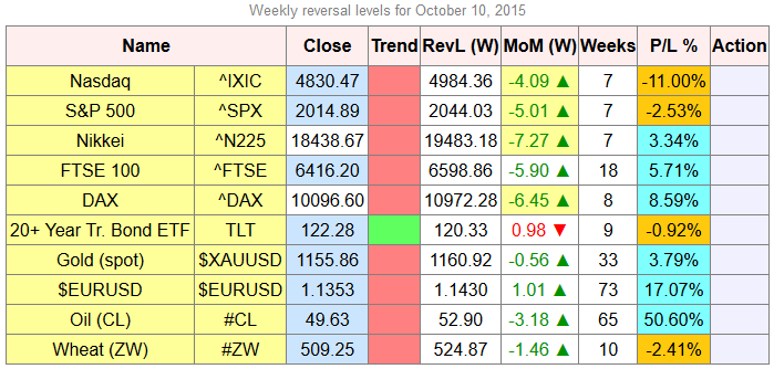 Weekly reversal levels with buy and sell signals for over 1500 stocks and ETF. Free (pay what you want). Covering stocks from Dow Composite, Nasdaq 100, S&P 500, S&P 400 mid caps, S&P 600 small caps, and more than 100 ETF * What you get: html document that will open in any standard browser (also on mobile). The tables are easy to sort and search. Includes instructions for use.