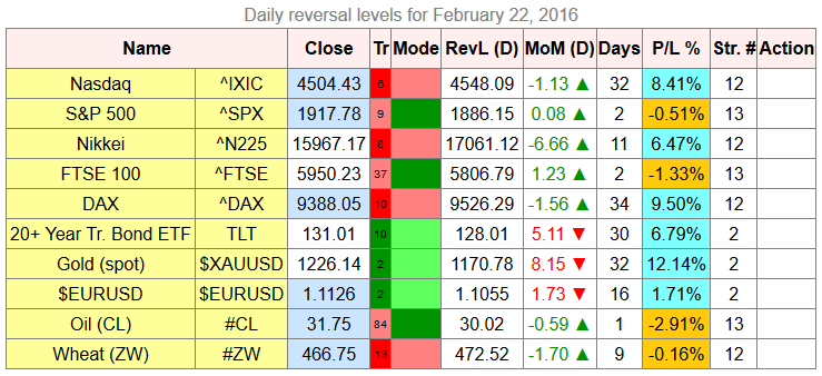 Daily reversal levels with buy and sell signals for over 2500 stocks and ETF. Covering stocks from Dow Composite, Nasdaq 100, S&P 500, S&P 400 mid caps, S&P 600 small caps, and more than 100 ETF